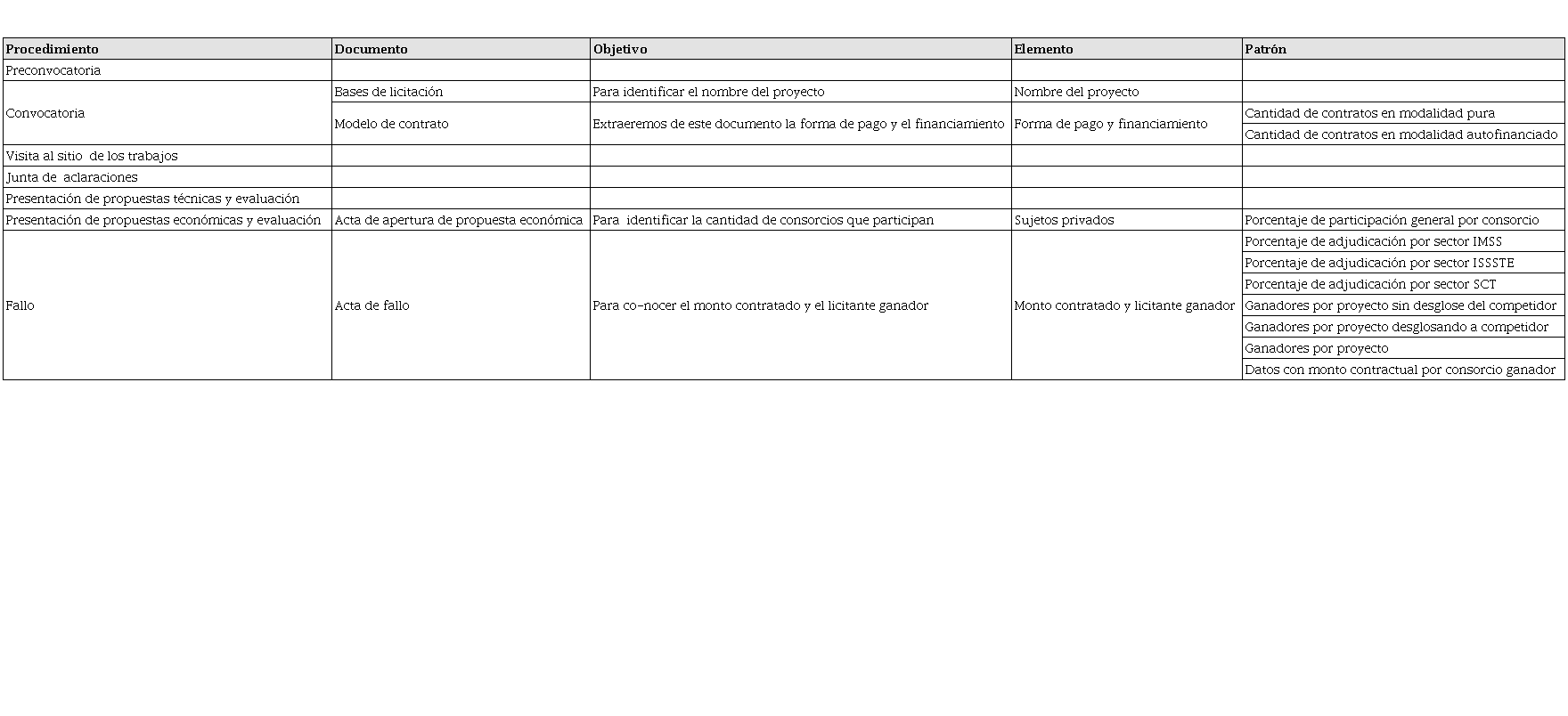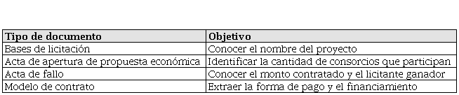 Una vez que delimitamos nuestra recolección de datos a doce proyectos y que identificamos el origen de donde se extraería la información, nos concentramos en recuperar los documentos que forman parte del proceso de licitación, los cuales pueden observarse en la tabla 3.