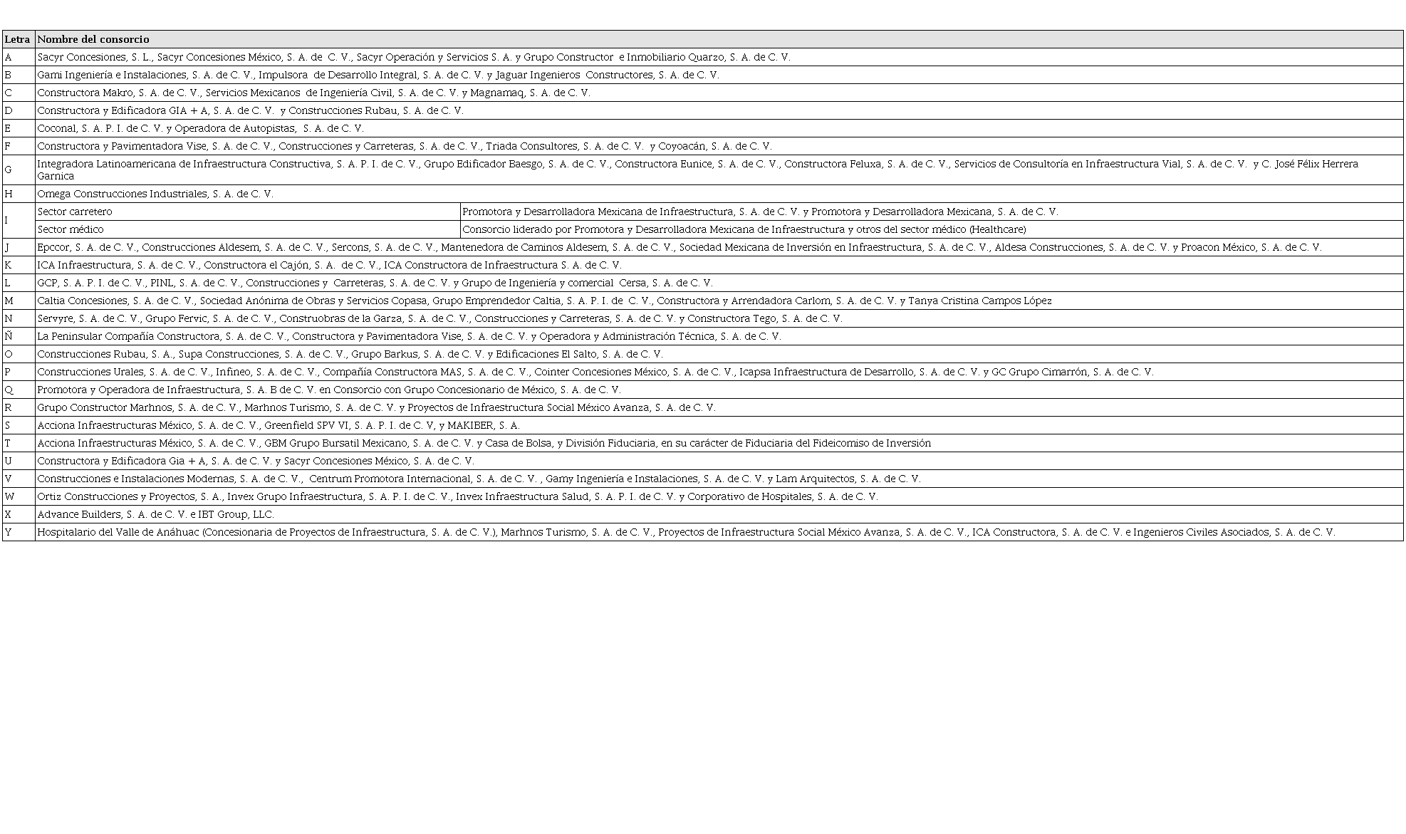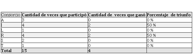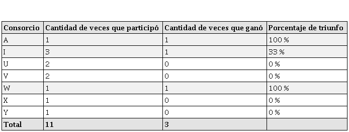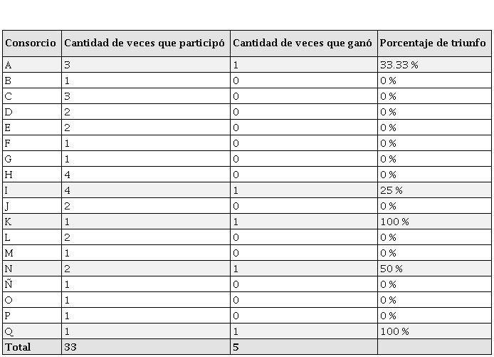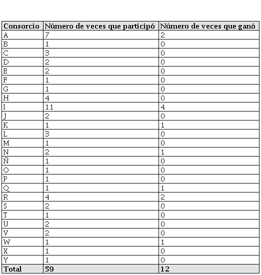 La matriz completa se puede observar en el anexo 1. La tabla 5 muestra los veintisiete consorcios, identificados cada uno con una letra del alfabeto, ya que, al ser la unión de varias empresas, los nombres son sumamente largos; además, se muestra el número de veces que participó y que ganó cada consorcio. Los nombres completos se pueden ver en el anexo 2.