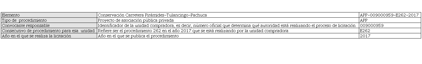 Para la recolección de datos, delimitamos nuestra investigación al proceso de licitación; para ello, primero identificamos la fuente que proporcionó los datos: recurrimos a información pública oficial, determinada por la misma LAPP, y nos enfocamos en la información pública que almacena CompraNet, también conocido como el “sistema electrónico de información público gubernamental sobre adquisiciones, arrendamientos y servicios del sector público federal, así como de obras públicas y servicios relacionados con las mismas” (Cámara de Diputados del H. Congreso de la Unión, 2018, art. 12, frac. V). Los funcionarios que liciten cualquier proceso de APP tienen la obligación de registrar la información relacionada con el proceso en CompraNet; para ello, se les asigna un número irrepetible. Como ejemplo de un número de procedimiento de licitación CompraNet y de la forma en la que se construye, obsérvese la tabla 1.