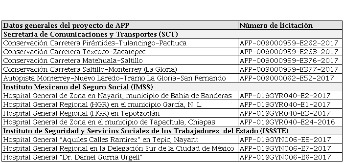 Estos doce procedimientos constituyen la totalidad del Bloque I del programa Estrategia de Impulso a los Proyectos APP, ejercicio fiscal 2017; están divididos de la siguiente manera: cinco de la Secretaría de Comunicaciones y Transportes (SCT), cuatro del Instituto Mexicano de Seguridad Social (IMSS) y tres del Instituto de Seguridad y Servicios Sociales de los Trabajadores del Estado (ISSSTE), lo que refleja que el sector carretero fue el que mayor cantidad de proyectos tuvo, con un 41.67 %, seguido del sector médico, dividido en dos: el IMSS con un 33.33 % y el ISSSTE con un 25 % del total.