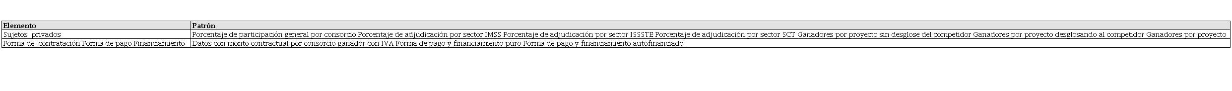 Al realizar el análisis de los fallos de licitación, y una vez identificados los consorcios ganadores, nos percatamos de los montos totales ganados por proyecto adjudicado: la forma de pago de once de los doce proyectos fue de modalidad pura, lo que implica que los pagos por los bienes y servicios públicos provienen en su totalidad de recursos públicos del Gobierno federal (Cámara de Diputados del H. Congreso de la Unión, 2017, art. 3, frac. IIIa).