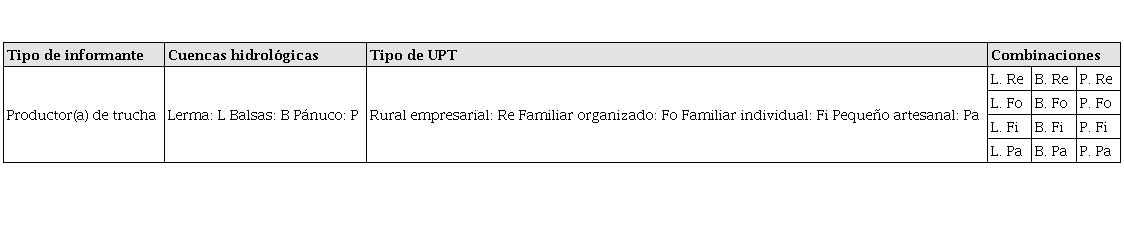 Se seleccionaron a diecisiete personas como informantes clave por la posición estructural y naturaleza social que representan. Esta selección incluyó a doce productores de truchas (representantes de distintos tipos de UPT), dos académicos, un funcionario de gobierno y dos personas de la sociedad civil. Para la selección de los productores, se consideraron tres aspectos fundamentales: 1) área en donde se tiene establecida la UPT, a partir de las tres cuencas hidrológicas que posee el Estado de México: Alto Lerma, Balsas y Pánuco; 2) tipo de UPT, de acuerdo con García-Mondragón et al. (2013): rural empresarial, familiar organizado, familiar individual y pequeño artesanal —esto permitió tener cuatro tipos de UPT distintos en cada una de las tres cuencas hidrológicas para un total de doce UPT como unidades de estudio (cuadro 1)—, y 3) consulta a profesionales para seleccionar a las personas que forman parte y conocen las redes, estructura y sistema de la actividad trutícola en el Estado de México.10 Estas personas se localizaron y fueron entrevistadas, primero, de manera exploratoria e informal; las que mostraron conocimientos y experiencia sobre el tema fueron entrevistadas en un segundo momento de manera formal.