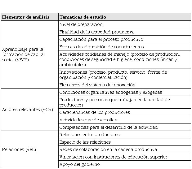 tas, debido a las restricciones sanitarias por la pandemia de la COVID-19. Los temas abordados en las entrevistas se organizaron en torno a tres elementos de análisis: i) aprendizaje para la formación de capital social, ii) actores relevantes y iii) relaciones. Se utilizaron estos elementos de acuerdo con Foster y Heeks (2013) con el fin de distinguir las capacidades y/o recursos organizativos en las