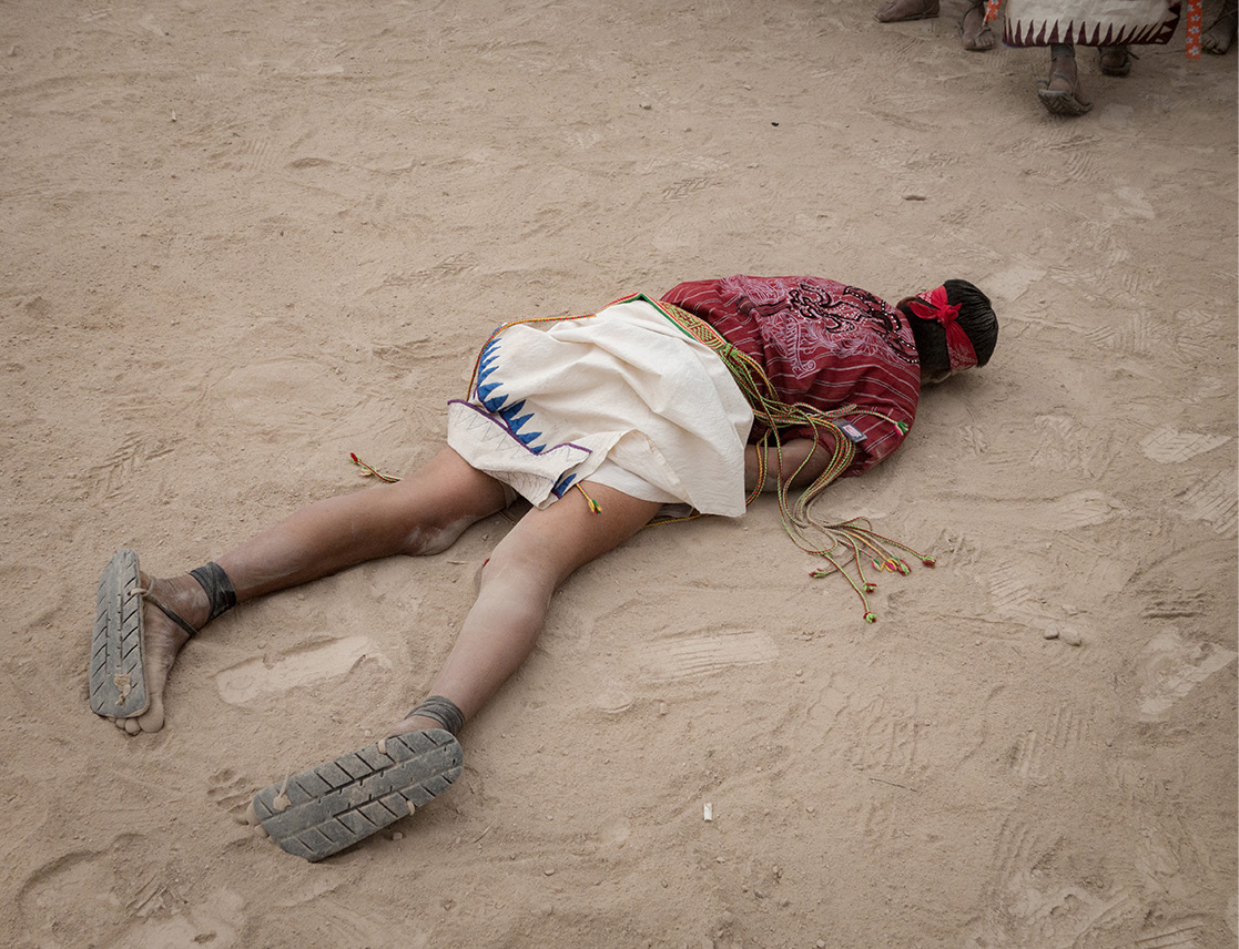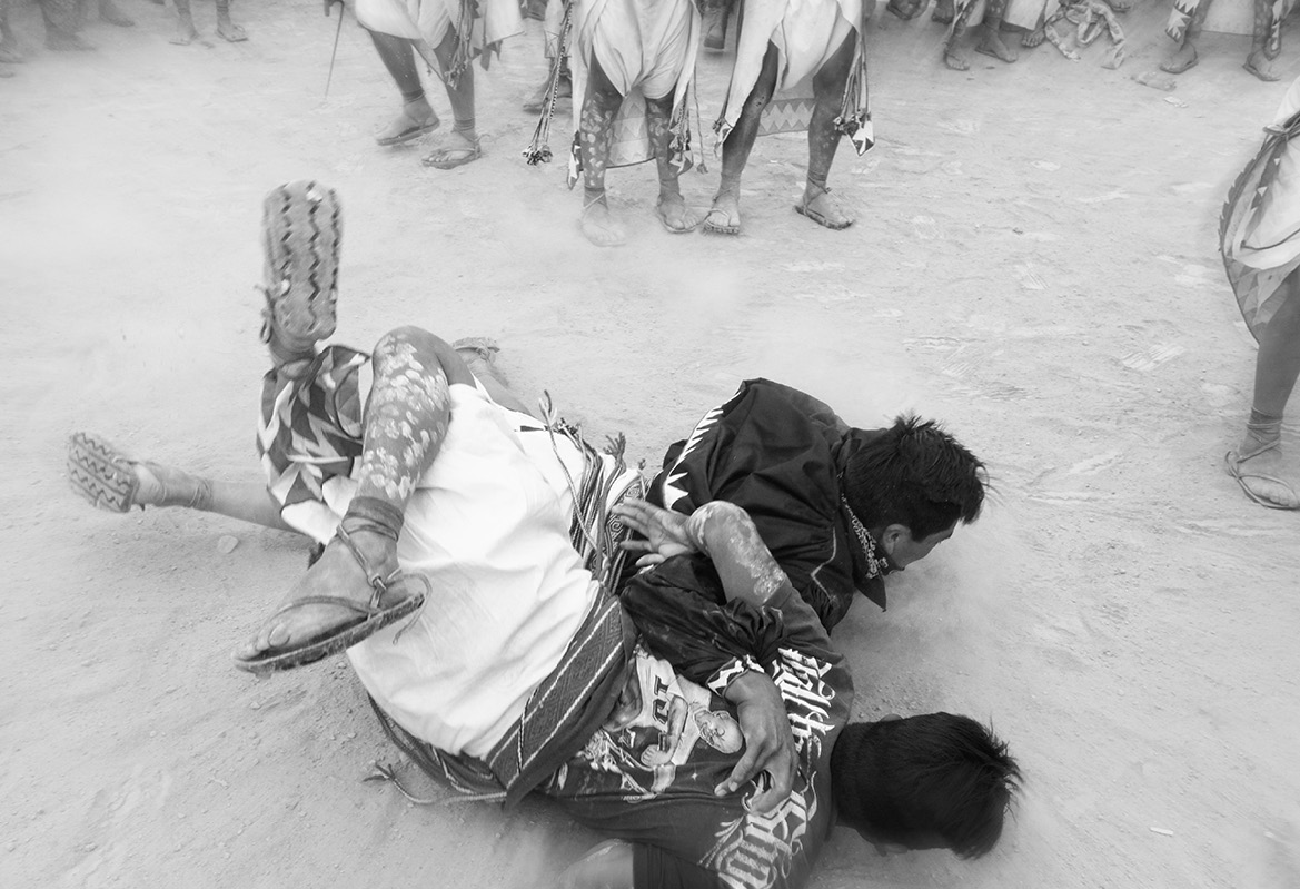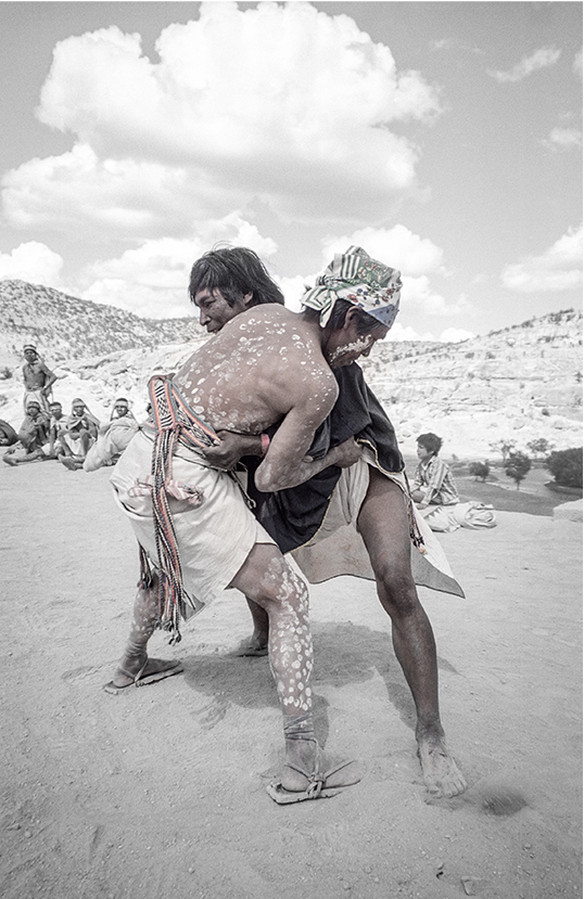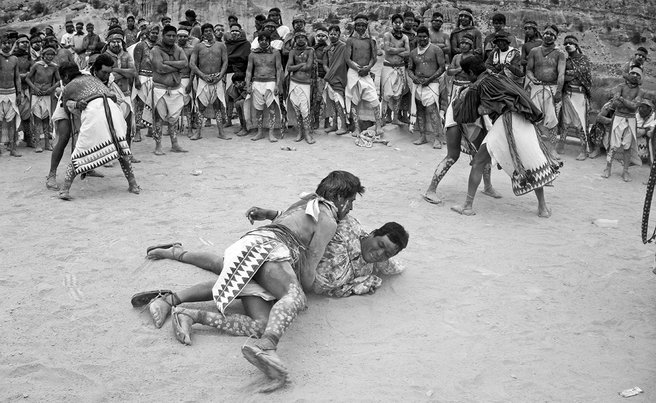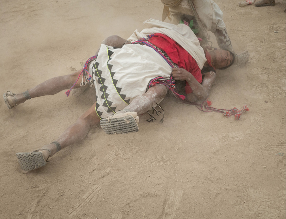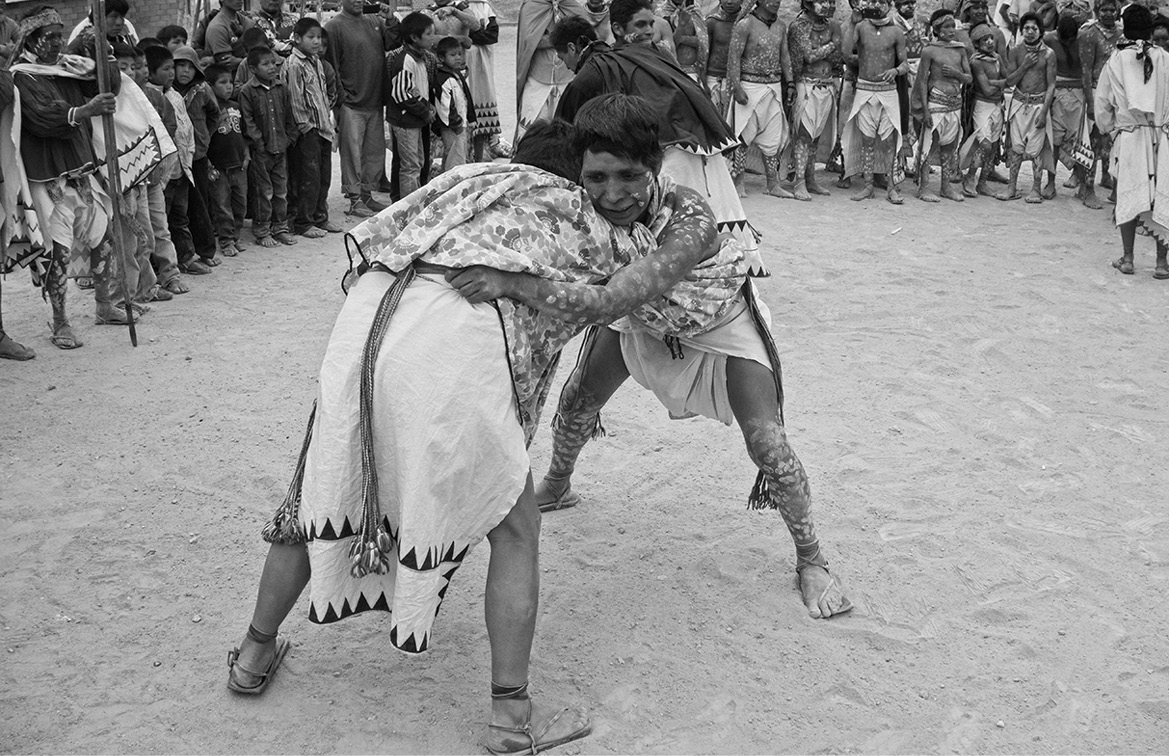 Con este acto, hemos llegado al momento más esperado tanto por los agentes rituales como por quienes asisten a la ceremonia: el de las luchas finales. En éstas se enfrentan un Soldado y un Fariseo; los dos escogidos por el Capitán de los Soldados —la figura de mayor cargo en esta época ritual— en virtud de una supuesta equivalencia de fuerza y masa corporal. Los dos luchadores se agarran por las fajas que ciñen sus taparrabos y cada uno intenta derribar al adversario. En todo esto, la fuerza es importante, desde luego, pero, cuando ésta es equivalente, entonces la “maña” es primordial, es decir, mantener amplias las bases de apoyo y saber captar las debilidades del adversario para llevarlo al punto de desequilibrio. Por lo visto, reconocí dos tipos de estrategias para tumbar al contrincante. La primera es escoger el momento apropiado para levantarlo y hacerlo caer de espalda, lo cual puede ser una tarea complicada puesto que el “levantado” siempre busca aterrizar con los pies firmes, hacia atrás. La segunda es levantar al otro luchador y hacerlo girar 360 grados para que, al momento de tocar el piso, se desequilibre por inercia rotatoria; el problema de esta táctica es que el adversario puede utilizar esta misma inercia para agarrar fuerza y voltear a su contrincante. También cabe precisar que no todas las luchas terminan con un ganador; al contrario, es frecuente que concluyan en un empate: cuando el capitán de los Soldados, quien funge como juez, considera que ninguno de los luchadores muestra suficiente fuerza para prevalecer sobre el otro, suspende la confrontación y declara el empate.