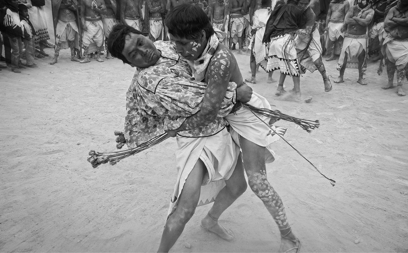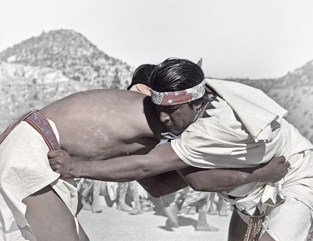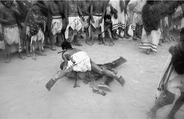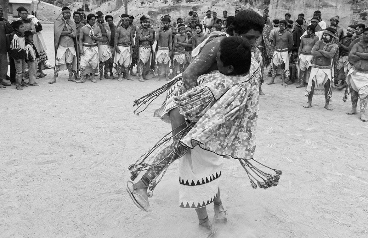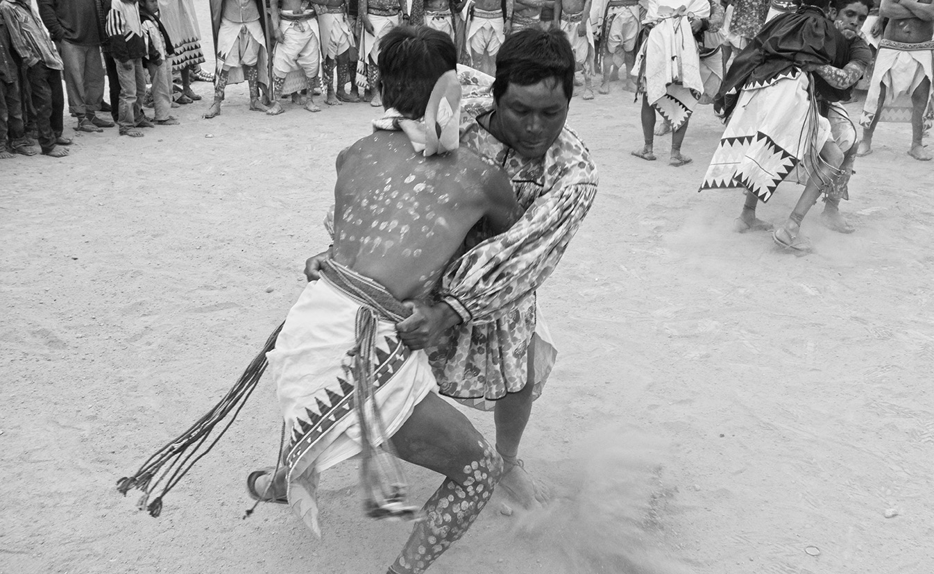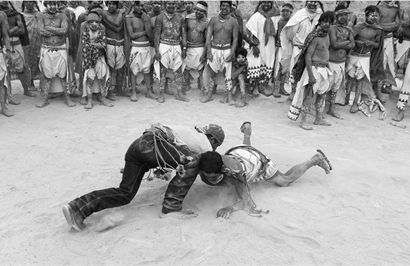 Con este acto, hemos llegado al momento más esperado tanto por los agentes rituales como por quienes asisten a la ceremonia: el de las luchas finales. En éstas se enfrentan un Soldado y un Fariseo; los dos escogidos por el Capitán de los Soldados —la figura de mayor cargo en esta época ritual— en virtud de una supuesta equivalencia de fuerza y masa corporal. Los dos luchadores se agarran por las fajas que ciñen sus taparrabos y cada uno intenta derribar al adversario. En todo esto, la fuerza es importante, desde luego, pero, cuando ésta es equivalente, entonces la “maña” es primordial, es decir, mantener amplias las bases de apoyo y saber captar las debilidades del adversario para llevarlo al punto de desequilibrio. Por lo visto, reconocí dos tipos de estrategias para tumbar al contrincante. La primera es escoger el momento apropiado para levantarlo y hacerlo caer de espalda, lo cual puede ser una tarea complicada puesto que el “levantado” siempre busca aterrizar con los pies firmes, hacia atrás. La segunda es levantar al otro luchador y hacerlo girar 360 grados para que, al momento de tocar el piso, se desequilibre por inercia rotatoria; el problema de esta táctica es que el adversario puede utilizar esta misma inercia para agarrar fuerza y voltear a su contrincante. También cabe precisar que no todas las luchas terminan con un ganador; al contrario, es frecuente que concluyan en un empate: cuando el capitán de los Soldados, quien funge como juez, considera que ninguno de los luchadores muestra suficiente fuerza para prevalecer sobre el otro, suspende la confrontación y declara el empate.