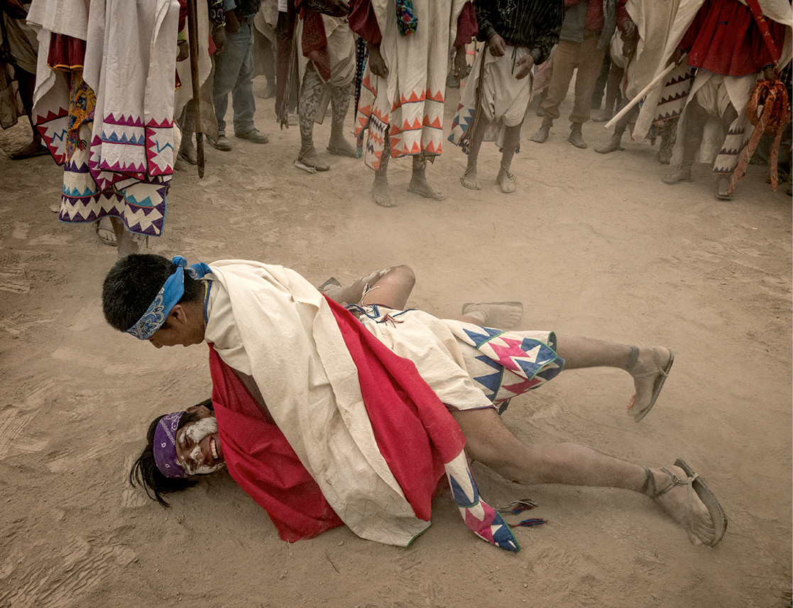 Escenas de las luchas rituales con las cuales se concluye el ciclo de Semana Santa. Tal como se comenta en el texto, las luchas se realizan entre un Fariseo (reconocible por el torso desnudo) y un Soldado. El ganador será el que logre tumbar a su adversario de espalda al piso. Si, dentro de un tiempo razonable, ninguno de los contendientes logra su propósito, el juez (el Capitán de los Soldados) declarará el empate.Tehuerichi, abril de 2015