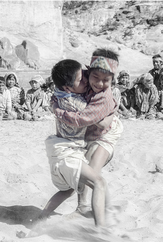 En este caso, se trata de un contexto no-ritual. Esta foto y las que siguen fueron tomadas en la Escuela Albergue de la comunidad. Por iniciativa del director de la escuela y por la correspondencia calendárica con el ciclo de Semana Santa, los niños y niñas de la escuela también experimentaron la emoción de las luchas.