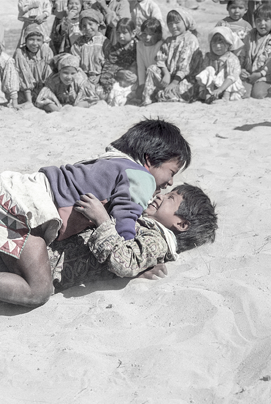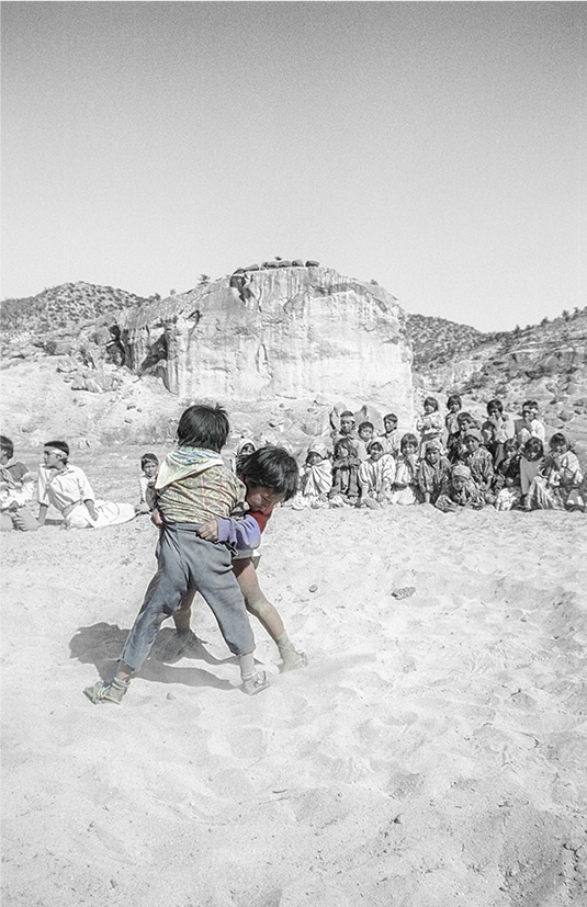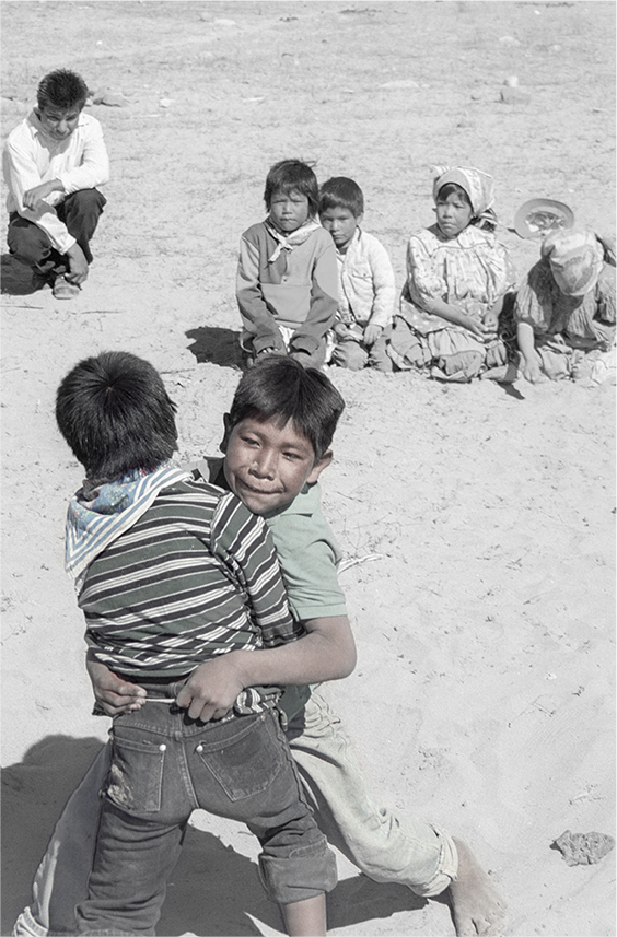 En este caso, se trata de un contexto no-ritual. Esta foto y las que siguen fueron tomadas en la Escuela Albergue de la comunidad. Por iniciativa del director de la escuela y por la correspondencia calendárica con el ciclo de Semana Santa, los niños y niñas de la escuela también experimentaron la emoción de las luchas.Tehuerichi, abril de 2002