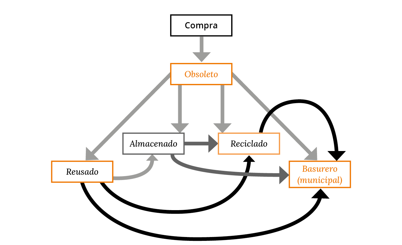 Se estima que tan sólo en Ciudad de México hay cincuenta mil personas dedicadas a la recolección, desmantelamiento y comercialización de desechos metálicos, de AEE y otros enseres. Las empresas de AEE han establecido un ciclo de vida de cuatro fases desde la adquisición de los equipos hasta su conversión en residuos (Baldé et al., 2017): 1) la entrada al mercado, 2) almacenamiento, 3) generación de residuos electrónicos y 4) gestión de los residuos electrónicos; sin embrago, su vida útil puede alargarse más allá de los tiempos de garantía, dadas las prácticas de reúso, almacenamiento (principalmente en los hogares y sitios de trabajo como oficinas y escuelas) y reciclado, antes de convertirse en RAEE.