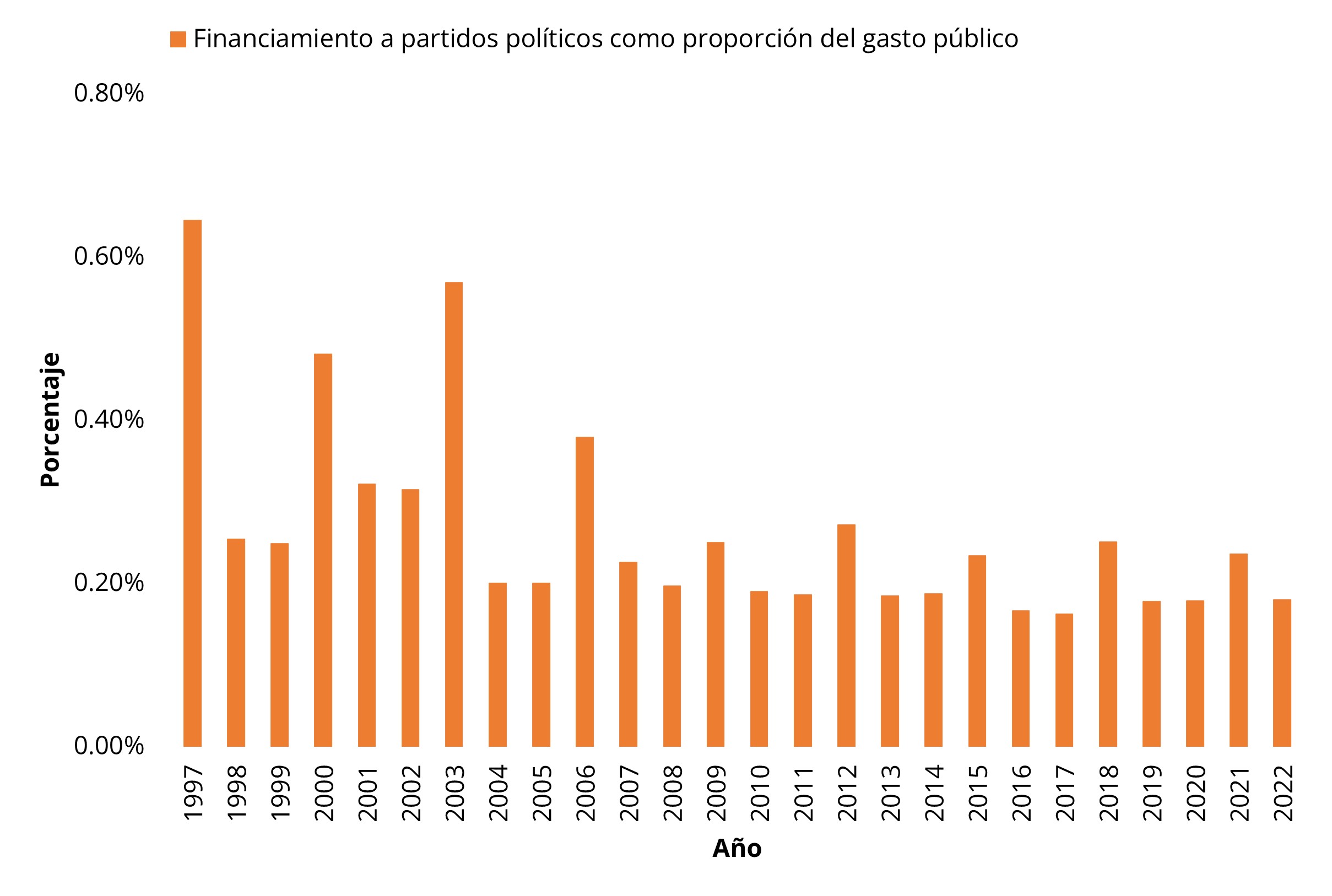 En la figura 5 se plasma la proporción comentada en la sección de metodología, donde se ha obtenido el cociente entre el financiamiento público de los partidos y el gasto público total. Se puede observar que dicha proporción ha disminuido persistentemente, producto de las reformas explicadas. La proporción puede ser comprendida como la importancia relativa del sistema de partidos políticos nacionales dentro del gasto público, la cual comenzó en 1997 con una importancia relativa del 0.64 % y para 2022 representa un 0.18 %.