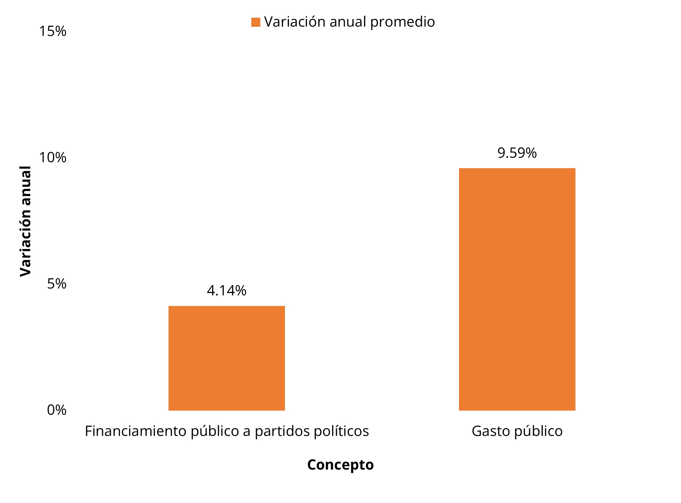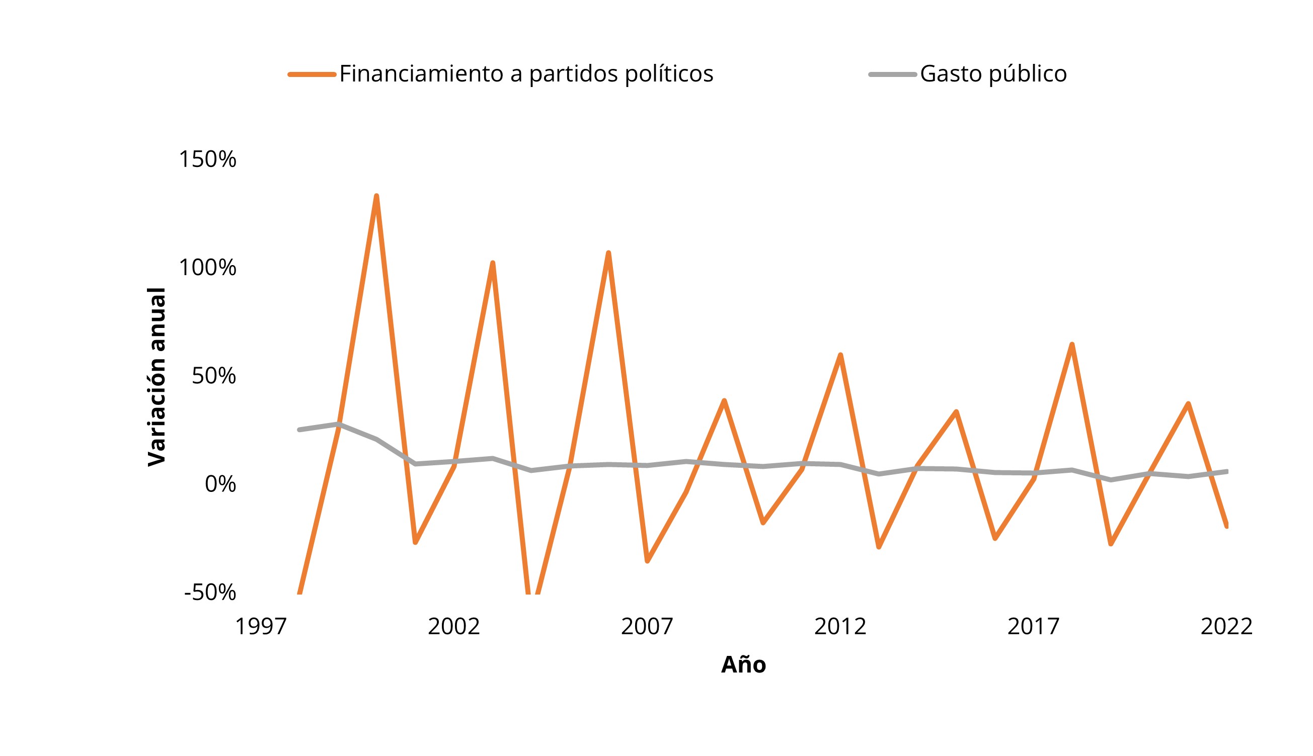 La disminución más grande de presupuesto para los partidos se dio en 2004, con una reducción del 62 %, mientras que el incremento de mayor magnitud fue en 2000, con un aumento del 133 %. Por su parte, el gasto público sólo ha tenido tasas de crecimiento positivas durante el periodo en cuestión: tuvo su menor incremento en 2021 debido a la pandemia global de la COVID-19 con un 4 %, y su mayor expansión fue en 1999 por un 28 %.
