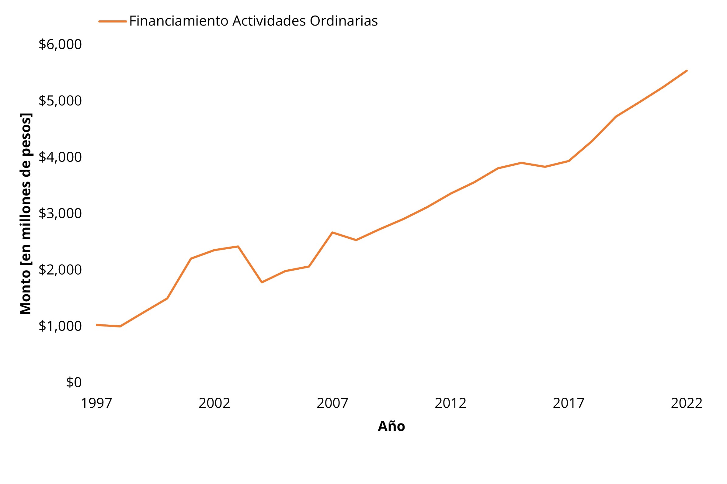 En la figura 1 se observa el componente de mayor magnitud en el financiamiento público para los últimos 26 años: las actividades ordinarias. En dicha figura se puede apreciar el incremento sostenible experimentado en el periodo en cuestión, donde destacan los años 1998, 2004, 2008 y 2016, por ser los únicos en donde existió una disminución en la asignación total. El monto máximo distribuido en este componente ha sido por $ 5,544 millones de pesos en 2022.
