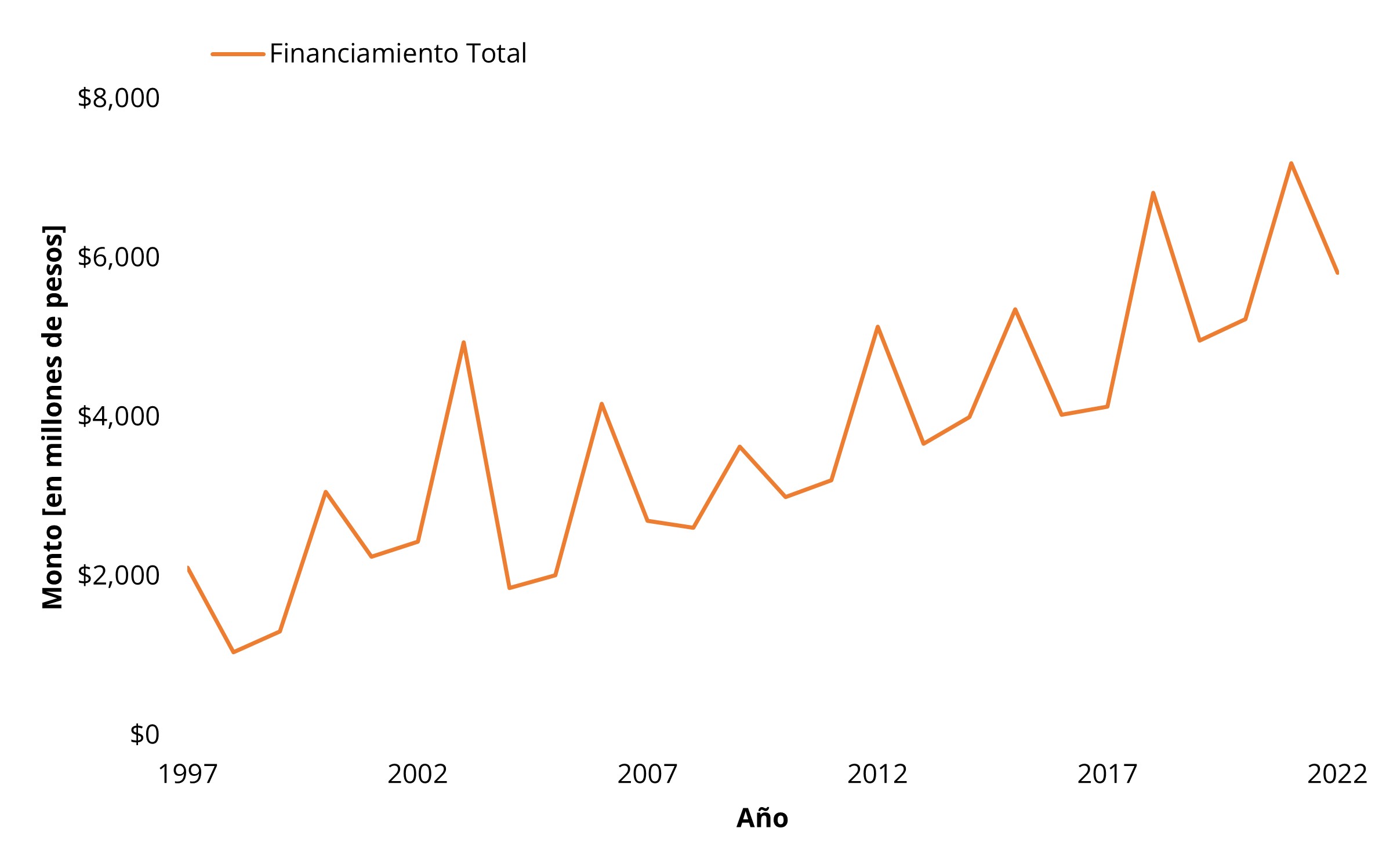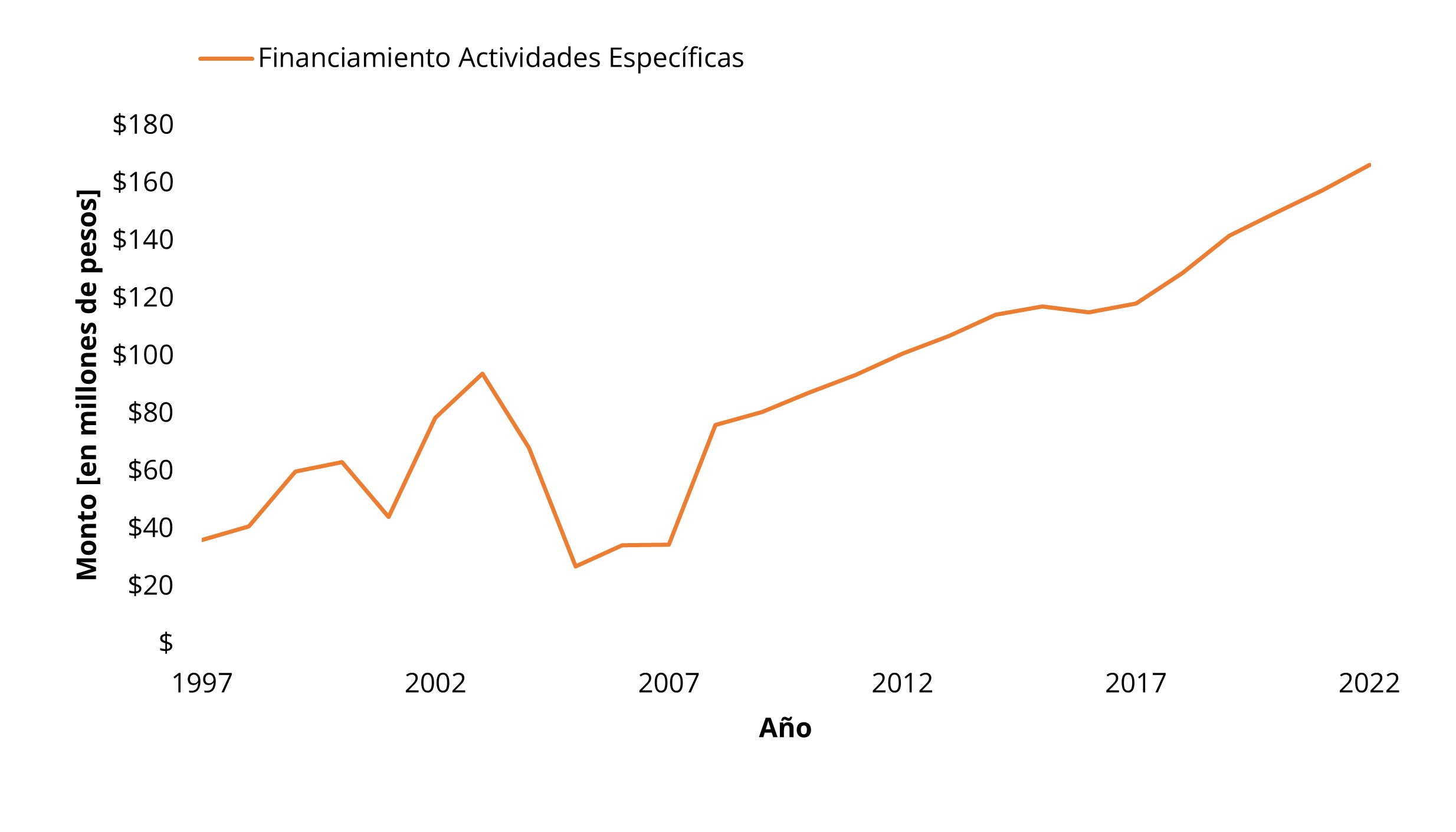 La figura 2 representa el financiamiento de actividades específicas durante los últimos veintiséis años, donde, a pesar de la tendencia alcista en dicho rubro, resalta el periodo comprendido entre 2004 y 2008, en el que hubo una volatilidad considerable. Nuevamente, el año con el mayor recurso en el componente ha sido el 2022 con 166 millones de pesos.