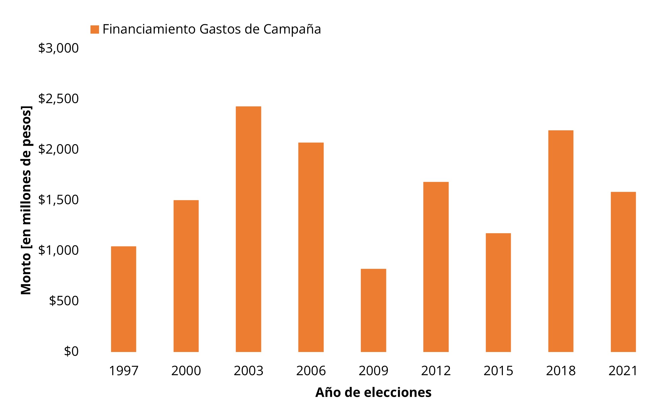 La figura 3 plasma los gastos de campaña que han sido financiados con recursos públicos; el gasto se hace cada tres años, debido a la periodicidad de las elecciones nacionales en México. En dicha figura, se puede apreciar la gran modificación que sufrió a partir del año 2009: antes, se determinaba duplicar el rubro de la actividades ordinarias mediante los gastos de campaña del año, es decir, se otorgaba un monto para la campaña igual al proporcionado a través de actividades ordinarias; sin embargo, a partir de 2009, la regulación cambió y se calcula como el 50 % del monto destinado a actividades ordinarias en los años donde hay elecciones nacionales para elegir presidente, y 30 % en el resto de las elecciones.