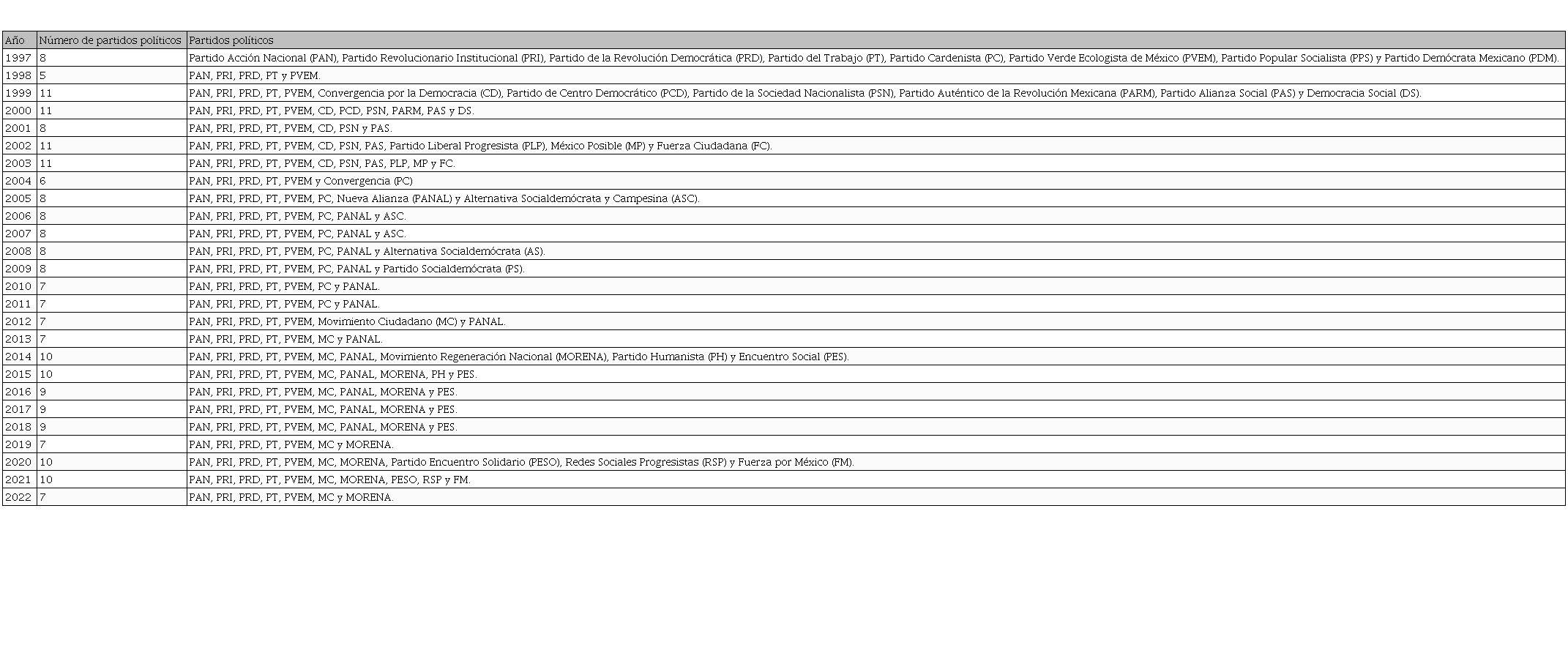 En la tabla 1 se plasma el número de partidos por año, durante el periodo de 1997 a 2022. El año que registra menor cantidad es 1998, con cinco; los años con mayor cantidad han sido 1999, 2000, 2002 y 2003. Como se aprecia en la tabla 1, después de una elección, el número de partidos se reduce por las reglas relacionadas al porcentaje mínimo de votos que deben obtener para mantener el registro como partido político.
