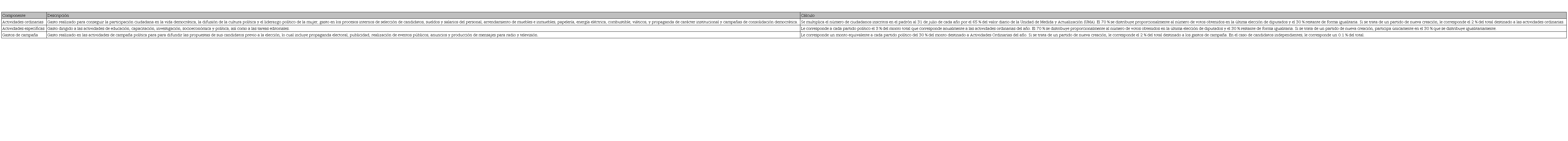 Cabe mencionar que, desde 2007, cada partido debe destinar el 2 % de sus actividades ordinarias a la capacitación, promoción y desarrollo del liderazgo político de las mujeres; sin embargo, dicha medida aún es un tema pendiente dentro de la agenda nacional por la equidad de género, debido a que se ha convertido en un proceso de simulación, ya que, por un lado, los partidos han destinado dichos recursos a actividades administrativas —como el pago de servicios básicos— porque no se ha determinado con precisión el significado de las medidas, y, por otro lado, no se les exige la entrega de evidencia relativa a las actividades realizadas; incluso, no se cuenta con sanciones económicas elevadas por disponer del recurso para otros fines (Cárdenas Morales, 2012).