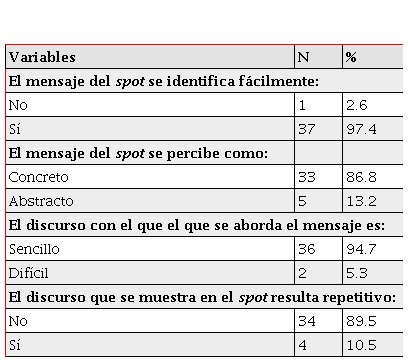 El mensaje empleado en los spots políticos de la LXIV Legislatura (ver Tabla 1) fue fácil de identificar en treinta y siete de los treinta y ocho casos (97.4 %). De la misma manera, el mensaje fue percibido como concreto en el 86.8 % de los casos (treinta y tres de las unidades seleccionadas para el análisis) y en el 13.2 % (cinco casos) el mensaje fue recibido como abstracto. Asimismo, el discurso con el que se abordaron los mensajes fue percibido en el 94.7 % de las ocasiones como sencillo (treinta y seis casos) y solamente en dos spots (5.3 %) resultó difícil. Por otro lado, el discurso abordado por los spots no fue repetitivo en treinta y cuatro de los casos (89.5 %), mientras que en el resto (10.5 %) sí resultó repetitivo.