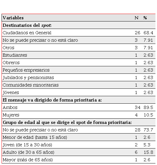 En la Tabla 2 se distingue que el 68.4 % de los spots (veintiséis casos) estuvo dirigido a la ciudadanía en general. Las opciones “No se puede precisar o no está claro” y la de “Otros” englobaron tres de los casos (7.91 %) cada una. Mientras que los estudiantes, obreros, pequeños empresarios, jubilados, comunidades minoritarias y jóvenes fueron los receptores en una ocasión (2.63 %) cada uno. De los treinta y ocho spots analizados, treinta y cuatro fueron dirigidos tanto a mujeres como a hombres (89.5 %), mientras que sólo cuatro (10.5 %) fueron dirigidos exclusivamente a las mujeres. Se destaca que ningún spot de la LXIV Legislatura estuvo dirigido exclusivamente a los hombres. En cuanto al grupo de edad destinataria de la publicidad, se encontró que en su mayoría no se podía precisar o no estaba claro, ya que en veintiocho de los casos no se pudo identificar (73.7 %), solo se identificó un caso en el que la publicidad fue dirigida a menores de edad (2.6 %), dos de los spots fueron dirigidos para jóvenes (5.3 %), mientras que en el 15.8 % por ciento se identificó que el mensaje iba dirigido a los adultos, y uno solo para adultos mayores (2.6 %).
