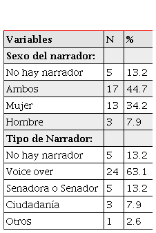 De acuerdo con la Tabla 3, en cinco de los spots analizados no se hizo uso de narrador (13.2 %); en los que sí se usó, en diecisiete (44.7 %) participaron tanto mujeres como hombres; en trece (34.2 %) sólo participaron mujeres como narradoras y únicamente en tres (7.9 %) los hombres fungieron como narradores únicos. En cuanto al tipo de narrador que se utilizó, de igual manera se registraron cinco spots en lo que no se hizo uso de narrador (13.2 %); también, se encontró que en el 63.1 % de los spots (veinticuatro) se utilizó una voice over, es decir, no se mostraba al narrador a cuadro; en cinco ocasiones (13.2 %), fueron los propios miembros de la Legislatura los que participaron en dichos spots; en tres casos (7.9 %), fueron ciudadanas y ciudadanos los que participaron como narradores, finalmente en un spot (2.6 %) fue otro tipo de narrador el detectado.