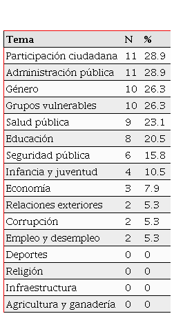 La Tabla 4 presenta los temas que se identificaron en los spots analizados, los cuales no son excluyentes uno de otro, es decir, que en un spot se puede encontrar más de un tema. Los temas más recurrentes fueron la participación ciudadana y la administración pública; cada uno de estos temas se trató en once ocasiones, lo que equivale a decir que estos temas se encuentran en el 28.9 % de la muestra, respectivamente. Otros temas que fueron abordados en los spots fueron el género y grupos vulnerables, cada uno con diez menciones (26.3 % de los spots). También fue importante la salud pública con nueve casos (23.1 %) y la educación con ocho menciones (20.5 %). En menor medida, se trataron temas como seguridad pública en seis casos (15.8 %), infancia y juventud en cuatro ocasiones (10.5 %), economía en tres casos (7.9 %). También se registraron los temas de relaciones exteriores, empleo y desempleo y corrupción en dos ocasiones cada uno (5.3 %). Temas como deportes, religión, infraestructura, agricultura y ganadería no fueron abordados en lo absoluto.