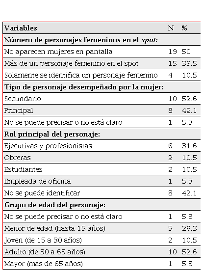 Asimismo, se analizó el oficio inferido que desempeñaban los personajes: se encontró que la mujer principal del spot apareció en seis ocasiones como ejecutiva o profesionista (31.6 %), obrera y estudiante en dos ocasiones cada una (10.5 % respectivamente) y como empleada de oficina una vez (5.3 %); hubo ocho spots en los que no había elementos suficientes para identificar la profesión u oficio que desempeñaba (42.1 %).