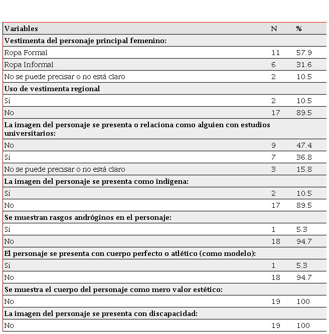 Acerca de la imagen del personaje femenino, se reportó que en el 47.4 % de las veces no se encontraron elementos para determinar si era alguien con estudios universitarios, en siete ocasiones sí se pudo determinar si era alguien con estudios universitarios (36.8 %) y en tres (15.8 %) spots no se pudo determinar. En cuanto a la representación de personajes femeninos como personas indígenas en dos casos se encontraron personajes femeninos representados como indígenas (10.5 %).