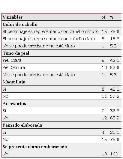 Se detectó una ocasión (5.3 %) en que las mujeres fueron representadas con rasgos andróginos y otra (5.3 %) en las que fueron representadas con cuerpos atléticos; no se encontraron personajes que se presentaran como mero valor estético ni personajes con alguna discapacidad.