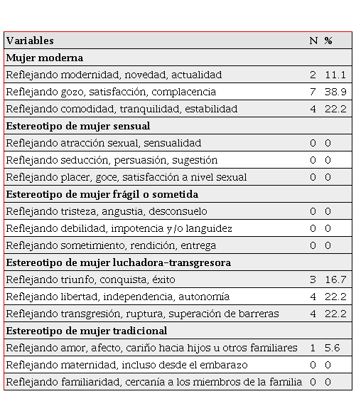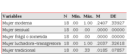 Para esta investigación, la imagen que se presenta de las mujeres ha sido analizada por medio de una escala de estereotipos utilizada en el estudio de Marañón et al. (2022). En general, éste señala que las mujeres se pueden representar de acuerdo con la siguiente clasificación: a) estereotipo de la mujer tradicional, que retrata a la mujer como una persona con inclinación a la vida familiar, ya que es su máxima fuente de felicidad; b) estereotipo de la mujer moderna, que las incita a estar al día sobre diferentes ámbitos (social, económico, político, laboral), no depender de alguien más, utilizar constantemente las Tecnologías de la Información y las Comunicaciones (TIC) y ser innovadoras; c) estereotipo de la mujer sensual, que desvaloriza a las mujeres al mostrarlas como un objeto: la promoción o venta de productos o servicios depende del atractivo físico, lo cual las reprime y limita ante la sociedad; d) estereotipo de la mujer frágil o débil, que representa a las mujeres como subordinadas de los hombres, necesitadas de protección, alejadas del mundo de la política, con poca inteligencia y sin carácter, y e) estereotipo de la mujer luchadora-transgresora, presentada como una mujer de carácter que no se encuentra conforme con el orden establecido y, por lo tanto, lo combate; si lo hace con éxito, llega a representar una figura que es digna de admiración.