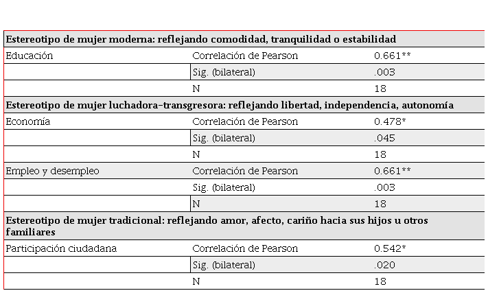 Se buscó la existencia de alguna correlación entre la manera en la que se presentaba a la mujer en los spots y los temas tratados en los mismos; para ello se utilizó la prueba r de Pearson. Se encontró que cuando los spots trataban sobre algún asunto de educación, el personaje principal femenino era presentado como una mujer moderna que refleja comodidad, tranquilidad o estabilidad (r = 0.661, p < 0.01). Asimismo, se observó una correlación de la mujer luchadora-transgresora que refleja libertad, independencia o autonomía con los temas de economía (r = 0.478, p < 0.05) y de empleo y desempleo (r = 0.661, p < 0.01); finalmente, se halló una correlación positiva entre la presentación de la mujer tradicional que refleja amor, afecto o cariño hacia sus hijos u otros familiares con el tema de participación ciudadana (r = 0.542, p < 0.05) (ver Tabla 10).