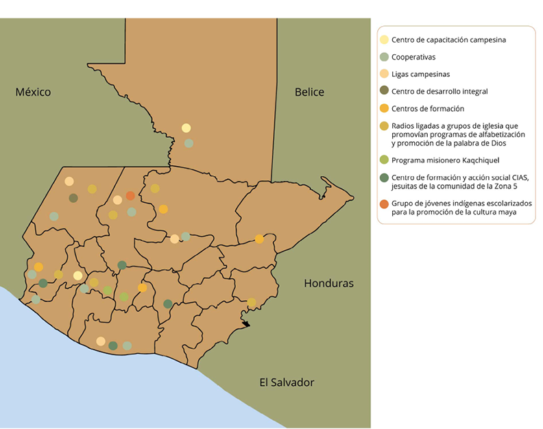 Como se puede ver en el mapa 1, estos espacios de formación cristiana se extendieron por todo el país, lo que permitió la consolidación de la formación política de quienes se encontraban en ellos. En el caso de las mujeres indígenas, estos centros y cooperativas fueron en muchas ocasiones el único espacio público de socialización, por lo que son una pieza clave para entender su emergencia como sujetas políticas.14
