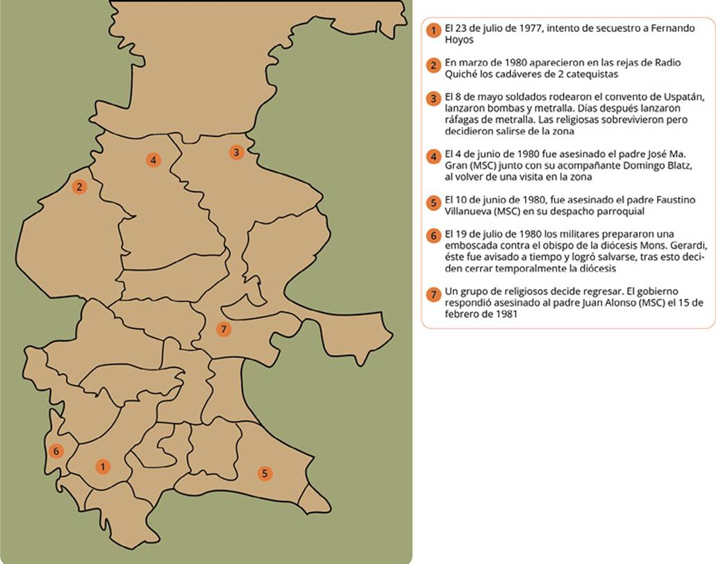 Ante la represión, algunos miembros de la jerarquía religiosa que se habían mantenido al margen con una posición conservadora comenzaron a radicalizar sus posturas; los casos más claros de ello fueron Monseñor Romero en El Salvador19 y Monseñor Gerardi en Guatemala, quien, al estar a cargo de la diócesis del Quiché, tuvo que atestiguar las atrocidades cometidas por el ejército contra la población en general y hacia los religiosos; esto lo llevó a hacer críticas más radicales al gobierno, lo que le valió un atentando en su contra. En el mapa 2 podemos ver cómo se dio el proceso represivo en el Quiché, lo que nos sirve para ejemplificar la situación represiva que vivían los religiosos en Guatemala.
