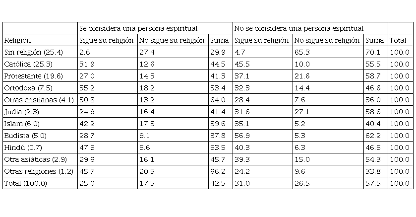 Por otro lado, aunque la dimensión espiritual del ser humano se suele dar por sentada en los estudios interdisciplinares economía-ética-religión, es necesario tomar en cuenta que el diálogo ha girado preferentemente alrededor de los valores, prácticas y creencias religiosas, los cuales pueden incluir, o no, a la espiritualidad. Por ejemplo, el 12.6 % de los católicos, el 16.4 % de los judíos y el 9.1 % de los budistas se consideran personas espirituales, pero no practican su religión; mientras que el 27.4 % del total de la población que no pertenece a religión alguna, acepta la espiritualidad (véase cuadro 1).