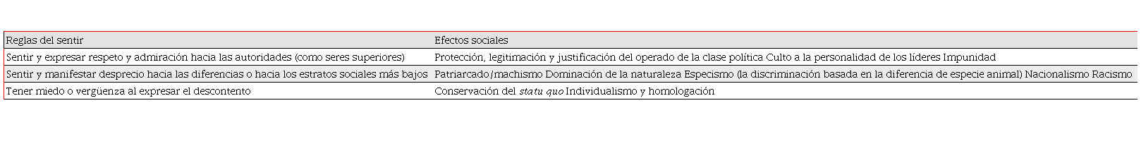Las reglas del sentir determinan qué emoción es oportuna en cada situación social; por ejemplo, estar tristes en un velorio o felices en una boda. Como indicó Hochschild (1975, 1979, 1983), las reglas del sentir sobrepasan la esfera personal, ya que involucran directamente las relaciones con nuestro entorno social. Estas reglas están incrustadas en las prácticas y los valores de los sujetos, e impactan nuestra forma de vivir y percibir la realidad. Por ejemplo, expresar respeto y admiración hacia las personas de éxito económico es una regla del sentir que legitima las prácticas de competencia, arribismo, individualismo y sumisión, valores propios del darwinismo social; además, esta regla alimenta emociones como la vergüenza, el descontento, la frustración y la desesperanza de quienes no logran subir la cuesta social y alcanzar el estado social esperado. Esto muestra cómo las reglas del sentir y las emociones expresadas o legitimadas por actores sociales como las élites políticas no son sólo una mera expresión individual: más bien, indican pautas a seguir para generar efectos en la sociedad (tabla).