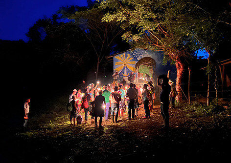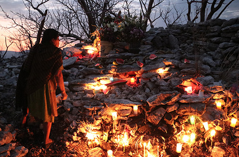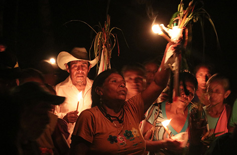 Casi al amanecer, los fieles bailan y encienden velas en el exterior de la capilla de Santa Juanita, antes de visitar la poza donde ésta habita. Durante la sequía, la poza se secó casi por completo.