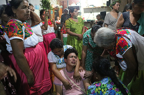 En otros pueblos de la Huasteca, los tlamatiketl (especialistas rituales nahuas) también hacen el costumbre de atlatahualiztli (petición de lluvia). Muy jóvenes, casi adolescentes, estos especialistas prestan sus cuerpos para que el niño-maíz hable. En la imagen, esta deidad llora por el maltrato y las faltas de respeto que los seres humanos cometen hacia la Santa Tierra.