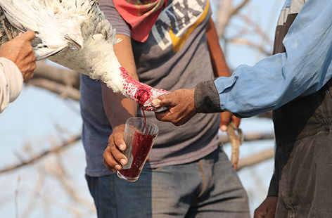 La ofrenda a las cruces implica sacrificios de sangre. En este caso, la víctima es el ave sagrada: el guajolote, cuya sangre se recoge para dar de beber a las cruces y al cerro mismo. La línea metonímica sangre-agua es común en todo el territorio mesoamericano.