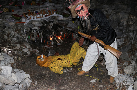 A medianoche se hace otro sacrificio en el cerro: el jaguar o tecuán, “devorador de gentes”, es rastreado por los cazadores y sus perros hasta ser cazado; su cuerpo se presenta ante las cruces como ofrenda, la cual se entrega a cambio de la lluvia.