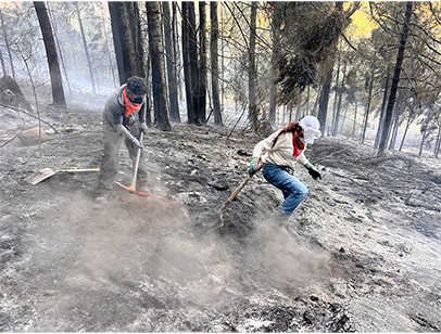 Una pareja de brigadistas combatiendo los incendios en el bosque de Jilotzingo; Semana Santa de 2024