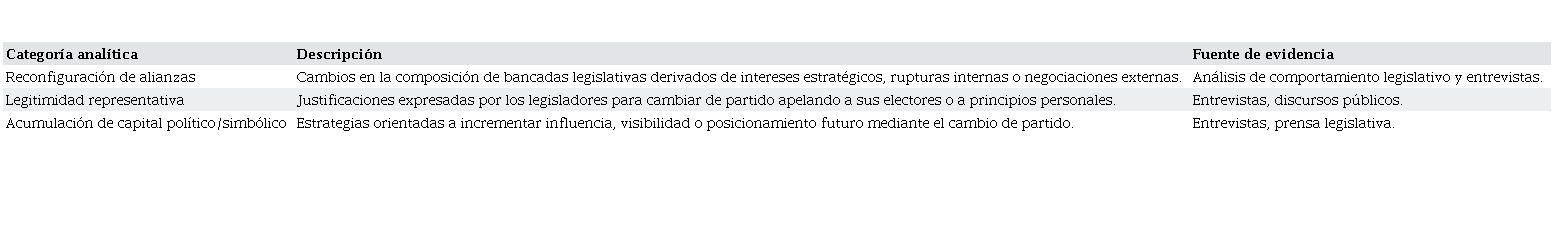 Así, el análisis se estructuró en torno a tres ejes que permiten desentrañar la lógica del transfuguismo: la acumulación de capital político y simbólico, sus efectos sobre la legitimidad representativa y la manera en que estas dinámicas reconfiguran las coaliciones dentro del Congreso. Las categorías sirvieron como ejes interpretativos para organizar y articular los hallazgos derivados de entrevistas, bases de datos legislativas y prensa especializada. La triangulación de los datos permitió detectar patrones convergentes y divergencias entre los distintos registros analíticos.