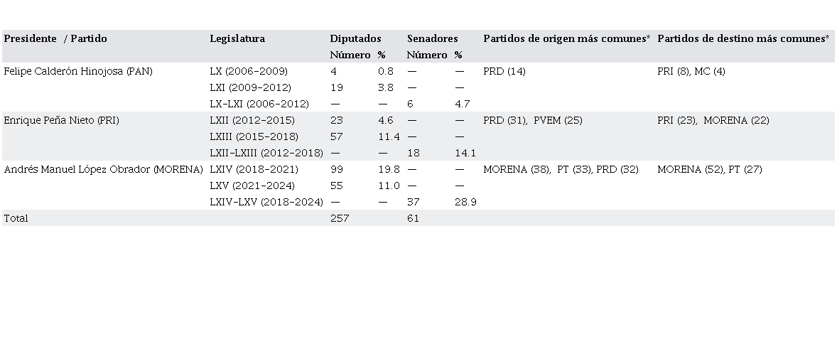 Durante el sexenio de Andrés Manuel López Obrador (2018-2024), el cambio de partido adquirió un nuevo cariz. En su ascenso como fuerza dominante en el Congreso, MORENA no sólo capitalizó sus victorias electorales, sino que incorporó a legisladores provenientes de partidos tradicionales. Uno de cada cuatro parlamentarios que cambió de bancada en ese período terminó en sus filas. Esta movilidad no sólo amplió su base legislativa, sino que le permitió consolidar una mayoría sin necesidad de recurrir nuevamente a las urnas. La estrategia de cooptación no sólo fortaleció el control del Ejecutivo sobre el Congreso, sino que modificó las reglas informales de la negociación legislativa, favoreciendo a quienes supieron reposicionarse con mayor oportunidad.