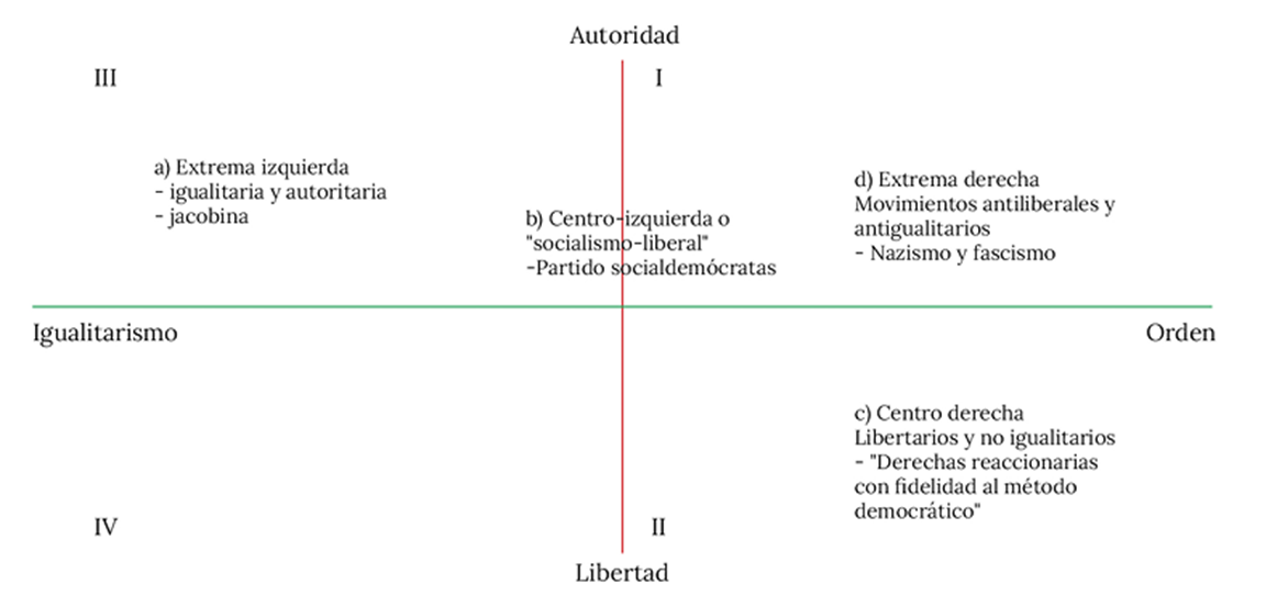 La tipología que propone Bobbio permite ubicar a las izquierdas que están por fuera del gobierno. Basado en el best seller, el plano político ubica cuatro cuadriles bajo el eje horizontal Igualitarismo-Orden y el vertical Libertad-Autoridad. Cartografiar este espectro político postsoviético permite visualizar dónde se ubican doctrinas y movimientos políticos identificados con la “extrema izquierda”, notando que, en la clasificación del politólogo italiano hecha hace treinta años, el cuadril IV, circunscrito entre el igualitarismo y la libertad, se encuentra vacío.