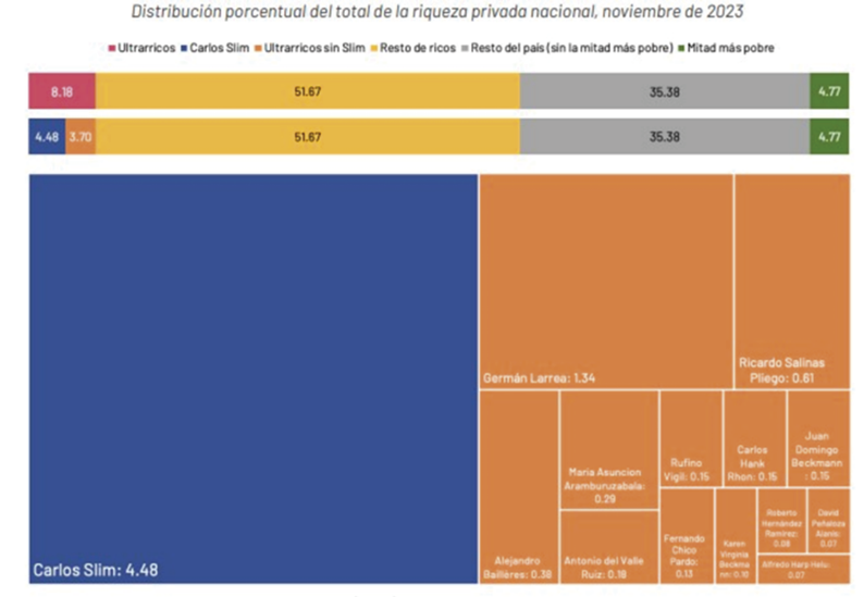 Carlos Slim es hoy el hombre más rico de la región, con una fortuna mayor que los otros 13 ultrarricos mexicanos juntos. La fortuna conjunta de Carlos Slim y Germán Larrea creció en 70 % durante los últimos cuatro años, hasta representar casi seis de cada 100 pesos de la riqueza privada en el país, cifra equivalente a la riqueza de la mitad de la población más pobre de América Latina y el Caribe —unas [sic] 334 millones de personas. (OXFAM México, 2024, p. 1)