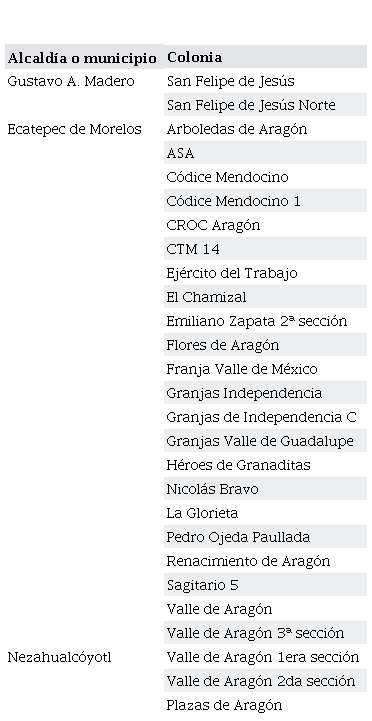 Debido a tales características, se ha seleccionado esta área como la zona de estudio. Comprende una superficie de aproximadamente 11 km2, la cual abarca veintisiete colonias (dos de la alcaldía Gustavo A. Madero, veintidós de Ecatepec y tres de Nezahualcóyotl). Fue determinada atendiendo la colindancia de las tres demarcaciones a partir de la estación Río de los Remedios como punto de referencia, y tomando en cuenta la traza urbana (véanse Tabla 1 y Figura 1).