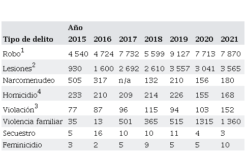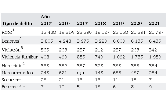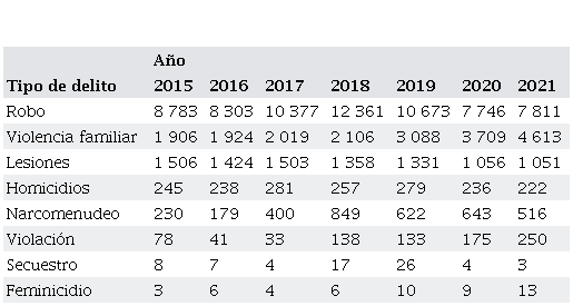 En el caso de los delitos cometidos en la alcaldía Gustavo A. Madero (GAM), puede advertirse que, entre 2016 y 2017, hubo un aumento significativo en el número de robos; entre 2017 y 2018, se observa un aumento en el narcomenudeo y las violaciones. En términos generales, la alcaldía sobresale por el elevado número de casos de violencia familiar (Tabla 2). Un punto interesante a destacar es la influencia de las medidas de contención de la pandemia de COVID-19 sobre los delitos: como podrá observarse en todas las tablas, a partir de 2020 las denuncias por violencia familiar aumentaron de manera importante; de acuerdo con análisis recientes, es posible que esto se debiera a las condiciones de estrés y aislamiento que se implementaron en gran parte de los hogares mexicanos (Gómez Macfarland y Sánchez Ramírez, 2020).