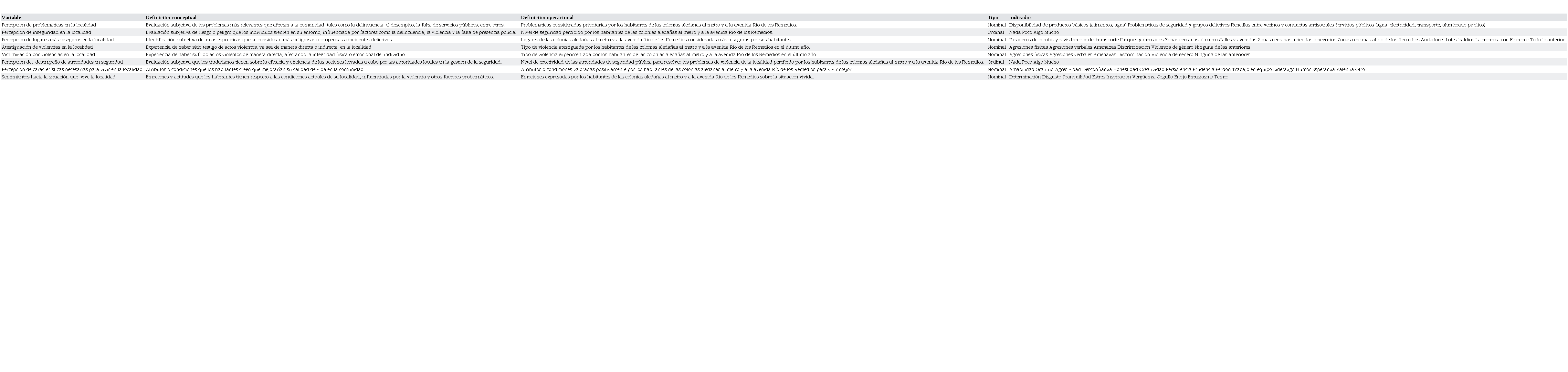 Tras un pilotaje realizado en marzo de 2021, se comenzó la publicitación de la encuesta tanto a través de la página “Así me cuido” como de otros grupos de Facebook integrados por habitantes de la zona de Río de los Remedios: entre ellos, “Valle de Aragón 1ra (Noticias, ventas libres sin restricciones)”, “Valle de Aragón 3ra sección (venta de servicios y productos, trabajos)” y “Río de los remedios, Renacimiento de Aragón Ecatepec”. Entre el 3 de septiembre y el 12 de noviembre de 2020, se recibieron 304 respuestas válidas. A continuación, en la Tabla 5, se muestra la operacionalización de variables para la encuesta.