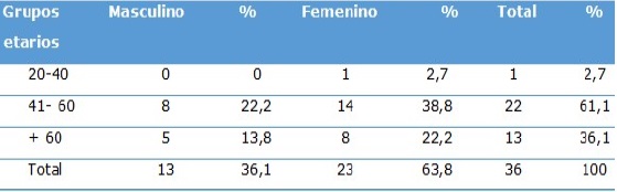 Se evidencia que las edades más frecuentes de los pacientes hipertensos en el estudio fueron las comprendidas entre 41 y 60 años, con el 61,1 % y el grupo de mayores de 60 años, con el 36,1 %. No resultó significativo el único caso encontrado en el grupo entre 20 y 40 años de edad.