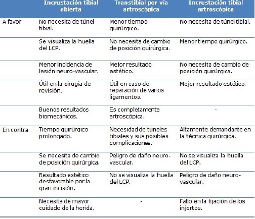En relación a las técnicas quirúrgicas de reconstrucción del LCP las más empleadas en la actualidad son: la incrustación tibial abierta, la artroscópica y la artroscópica trans-tibial, 20) cada una con elementos a favor y otros en contra (Tabla 1). 42,43,44