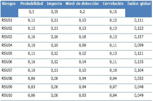 Se procedió a aplicar el método de Saaty por criterios de decisión al lograr una inconsistencia aceptable (permitió obtener el peso de cada criterio) por lo que se continuó con la construcción de la jerarquía de Saaty para calcular el índice global de cada riesgo (Tabla 2).