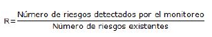 En esta investigación se propone un segundo indicador denominado Detección de Riesgos(DR) para medir la capacidad de detectar los riesgos relevantes en la entidad por el equipo gestor, este cuenta con un umbral del 100 %, sin embargo, se propone que las entidades hospitalarias pudieran aceptar hasta un 95 % (ecuación 3, ecuación 4).