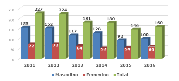 En el caso particular del CP en Camagüey, según los datos aportados del departamento de registros médicos y estadísticas de la provincia de Camagüey al anuario estadístico de salud de 2016, 2) en un análisis de seis años, en el período 2011-2016 mostró como resultado una incidencia de 1 118 (Gráfico 2).